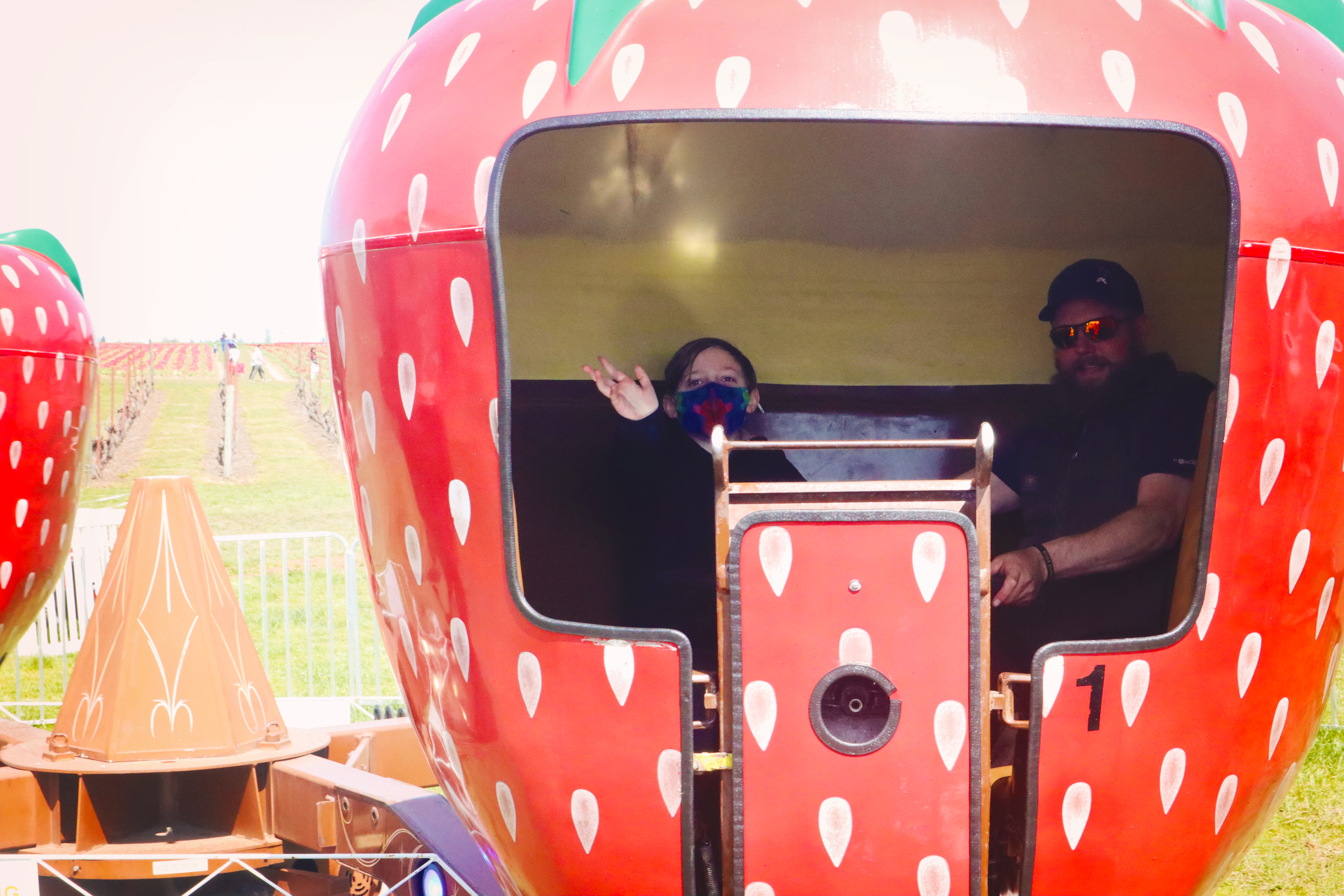 Once lunch was done, the carnival was the next stop and middle son took to the largest slide he had ever seen, while the other two tried to get on a bounce house, but didn't have the patience to wait in the line. Instead, they made their way to the spinning strawberries reminding me of the tea cups at Disneyland when we spun around so fast that one of my younger brother's was almost sucked out by the momentum. Ah, good memories.